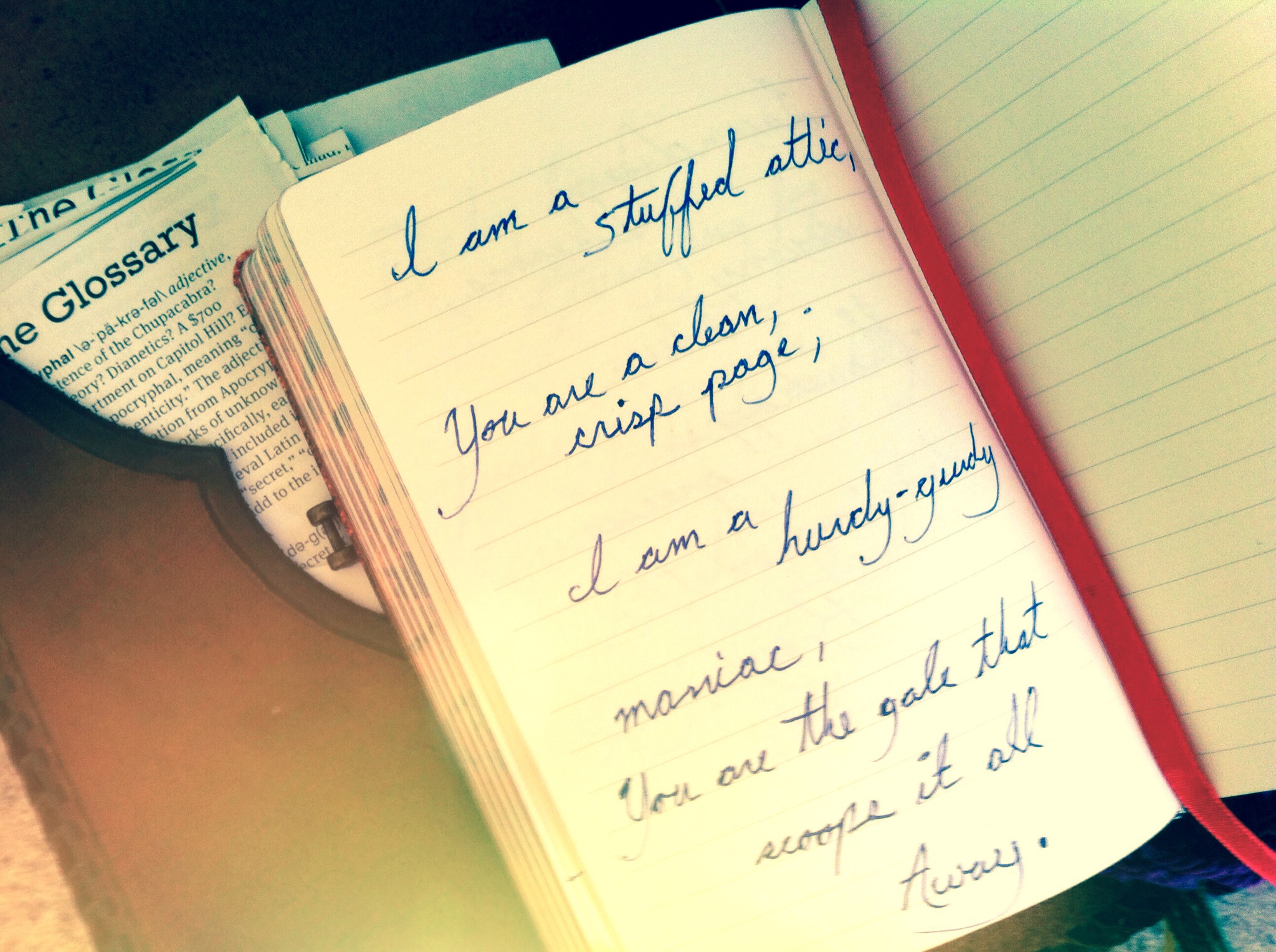 Pocket Writings #03 I am a stuffed attic, you are a clean, crisp page; I am a hurdy-gurdy maniac, you are the gale that scoops it all away. Share this: Click to share on Facebook (Opens in new window) Facebook Click to share on X (Opens in new window) X Click to share on Pinterest (Opens in new window) Pinterest Click to share on Tumblr (Opens in new window) Tumblr Click to share on Telegram (Opens in new window) Telegram Click to share on Reddit (Opens in new window) Reddit Click to share on Pocket (Opens in new window) Pocket Like Loading...